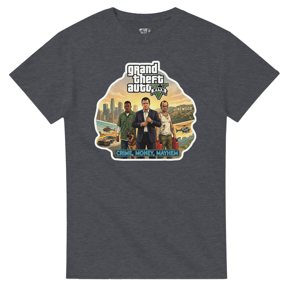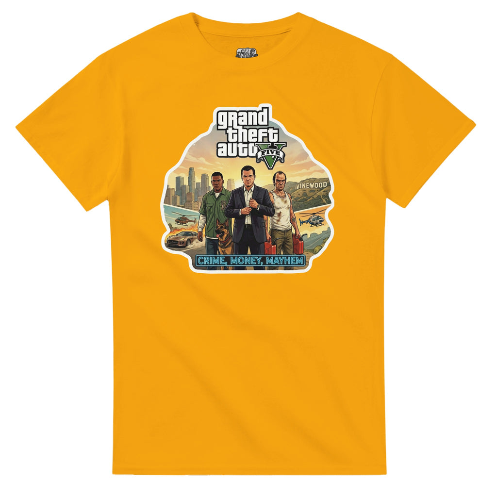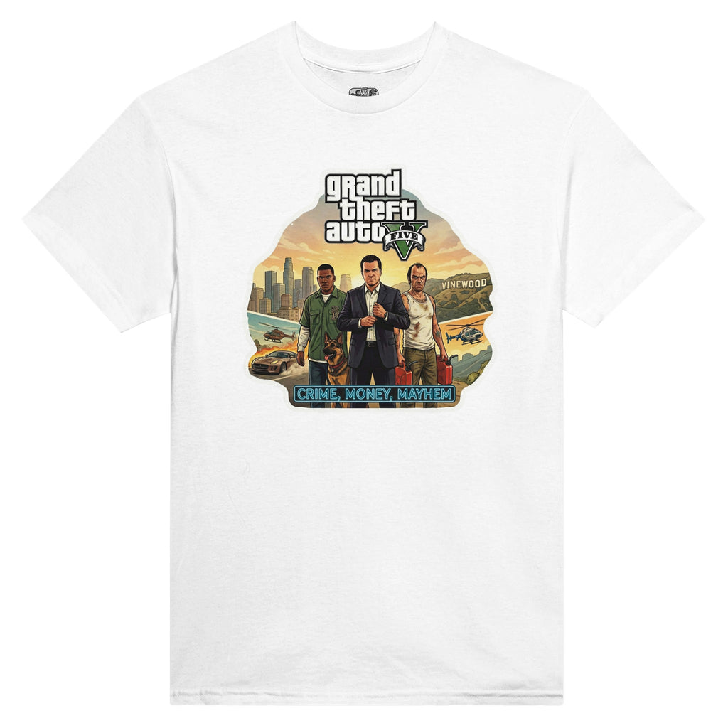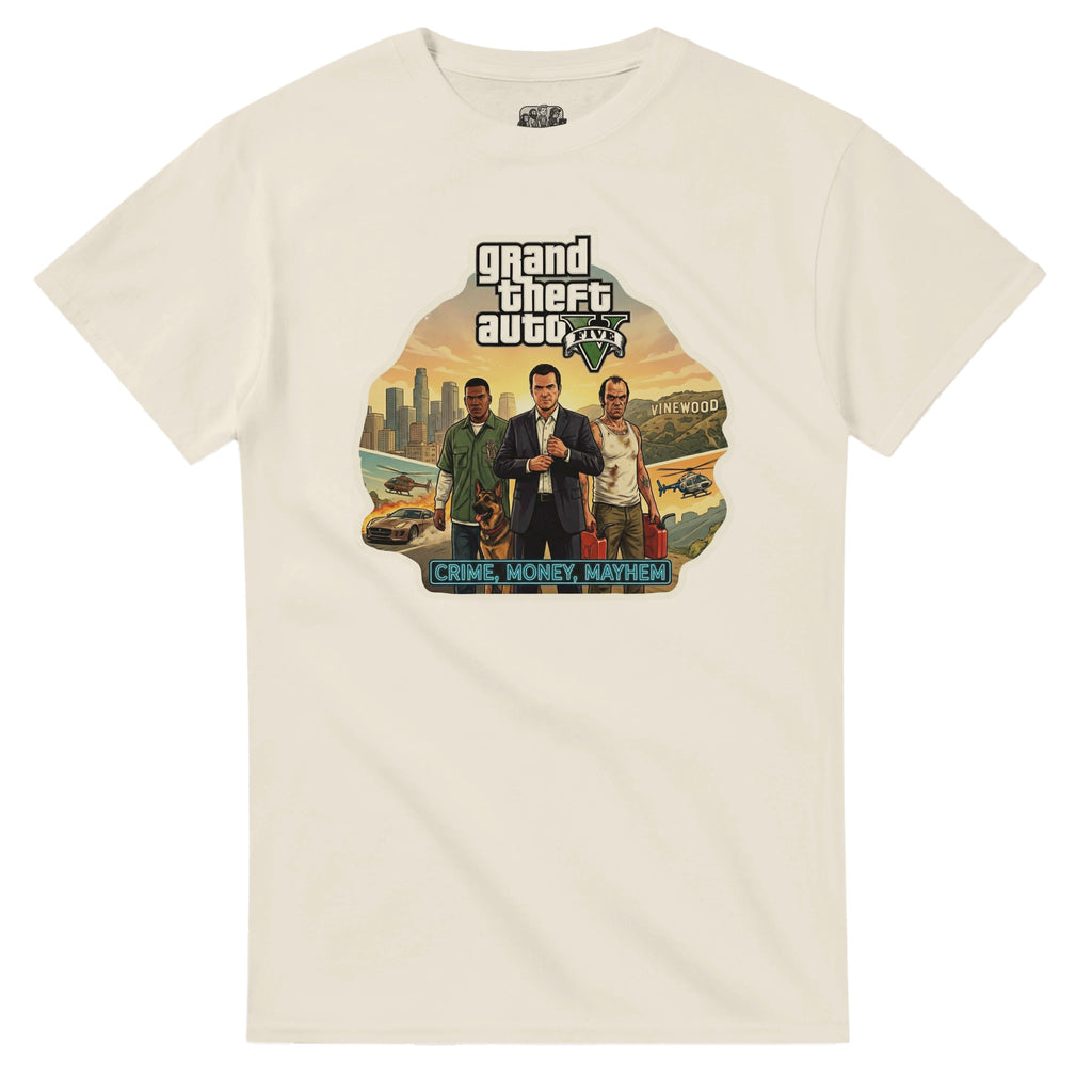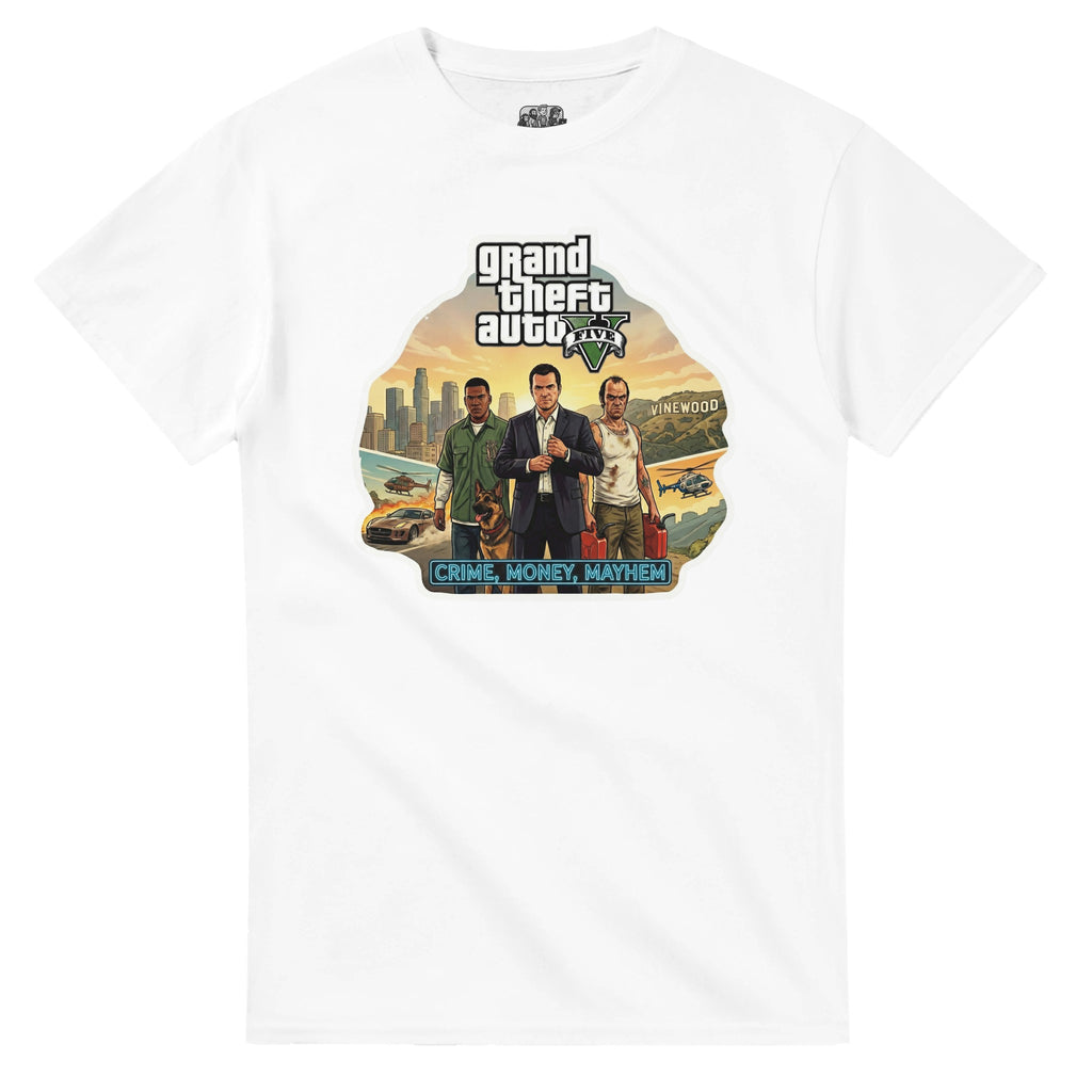 GTA V Crime, Money, Mayhem Heavyweight Unisex T-Shirt | Gildan 5000 brings Los Santos energy to a durable classic fit. The GTA V Crime, Money, Mayhem Heavyweight Unisex T-Shirt | Gildan 5000 is built for long days and longer nights.