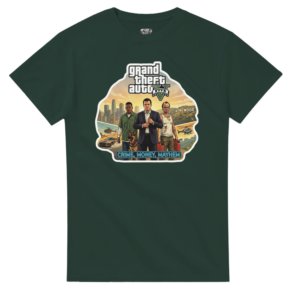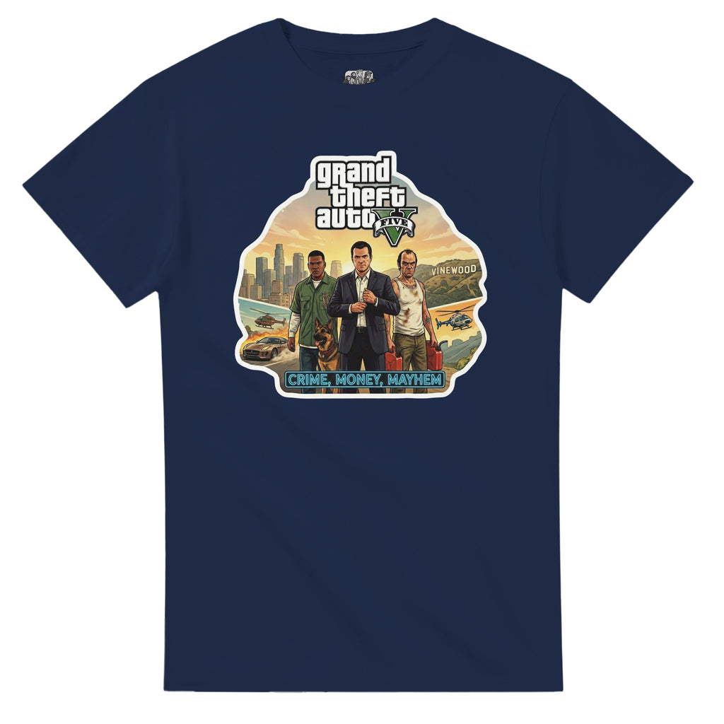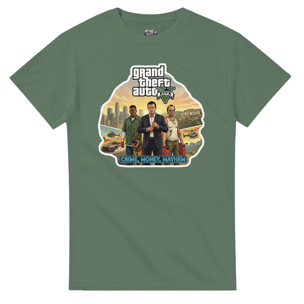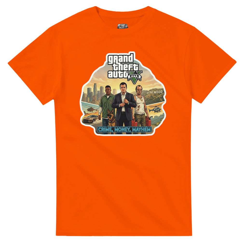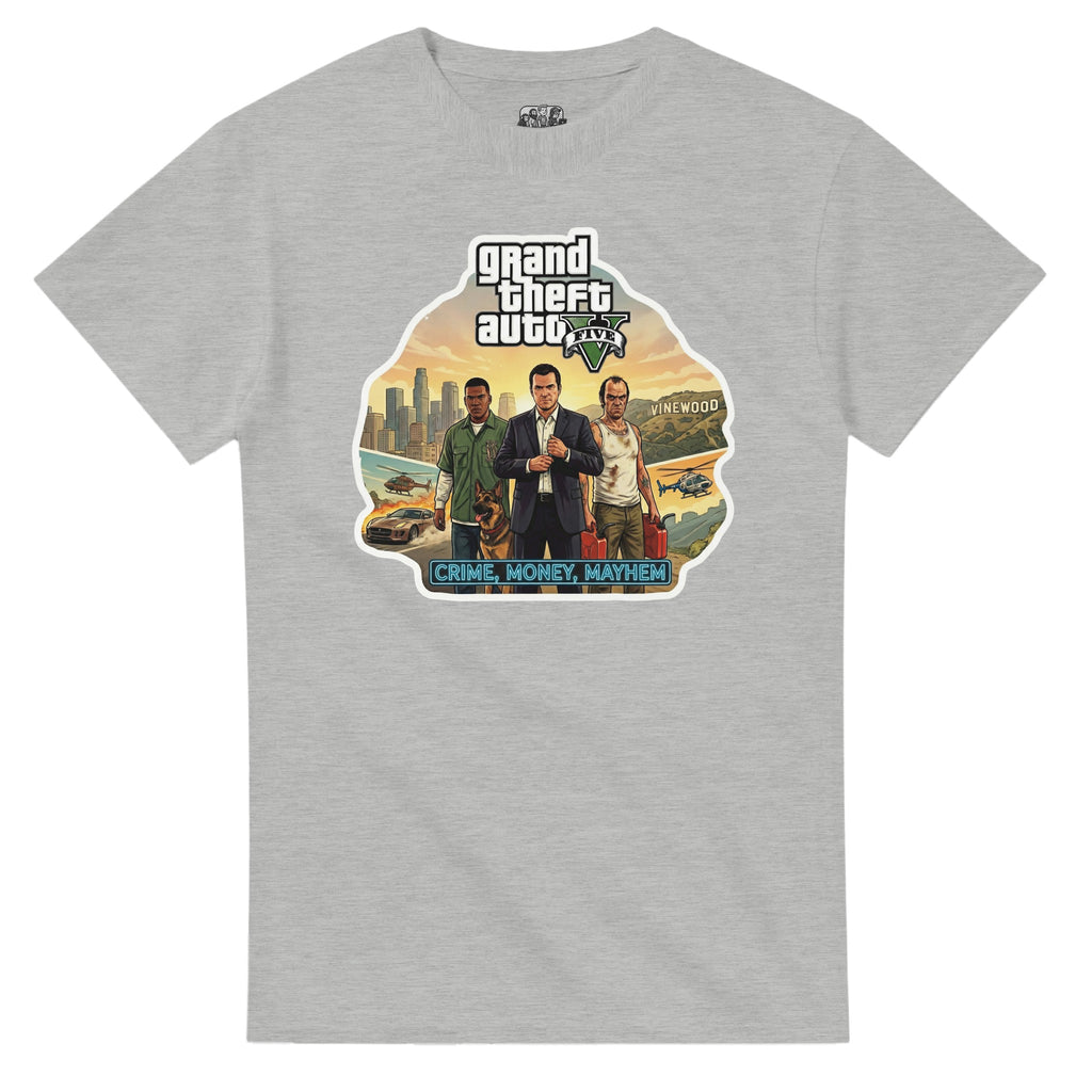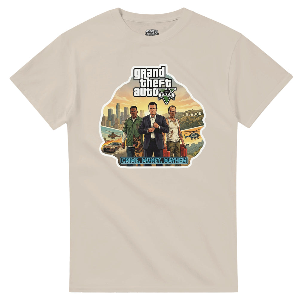 GTA V Crime, Money, Mayhem Heavyweight Unisex T-Shirt | Gildan 5000 brings Los Santos energy to a durable classic fit. The GTA V Crime, Money, Mayhem Heavyweight Unisex T-Shirt | Gildan 5000 is built for long days and longer nights.