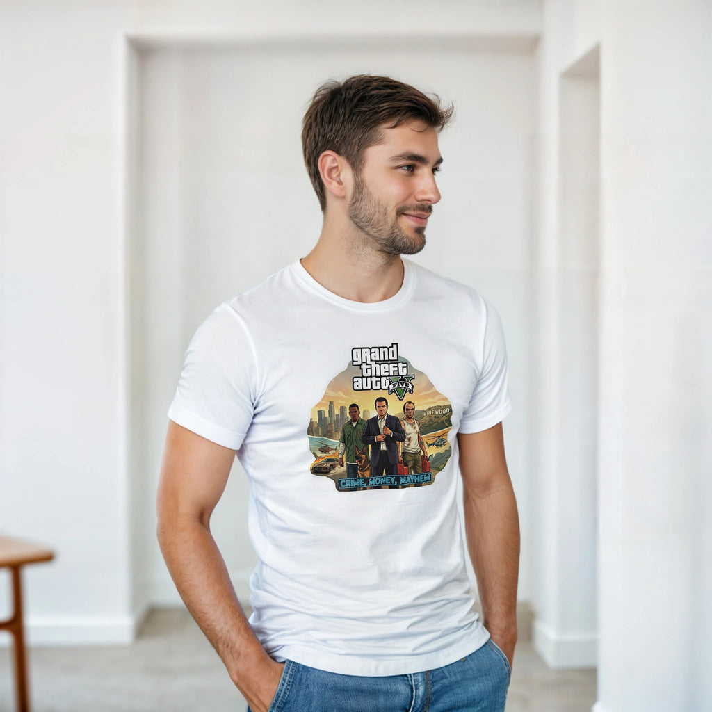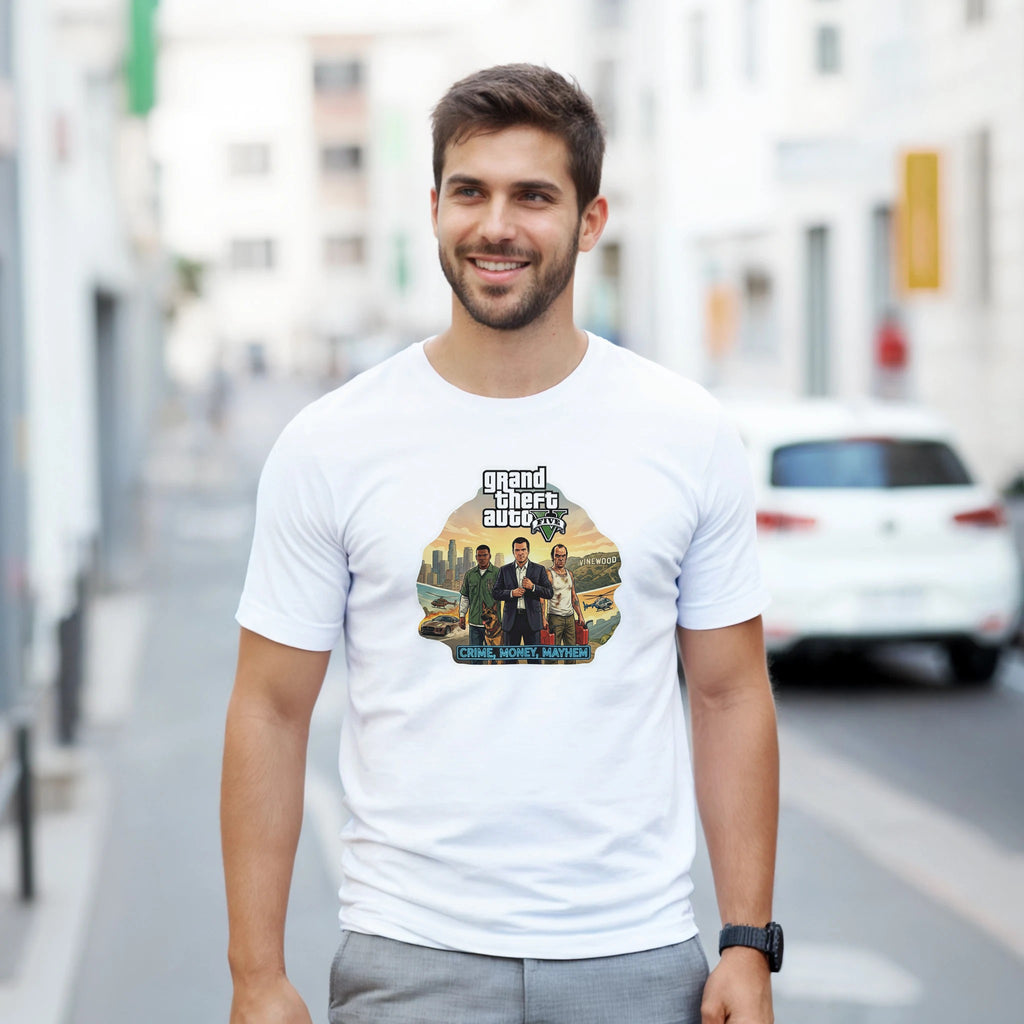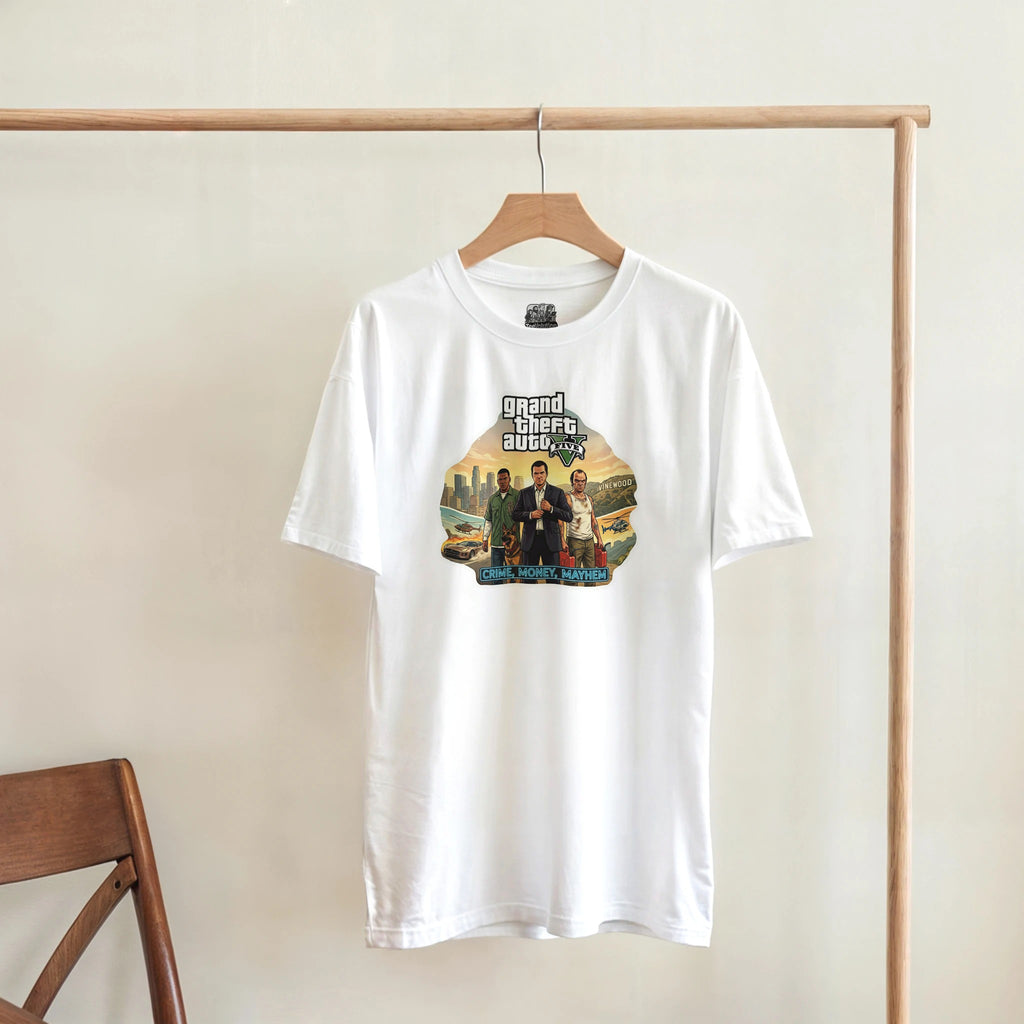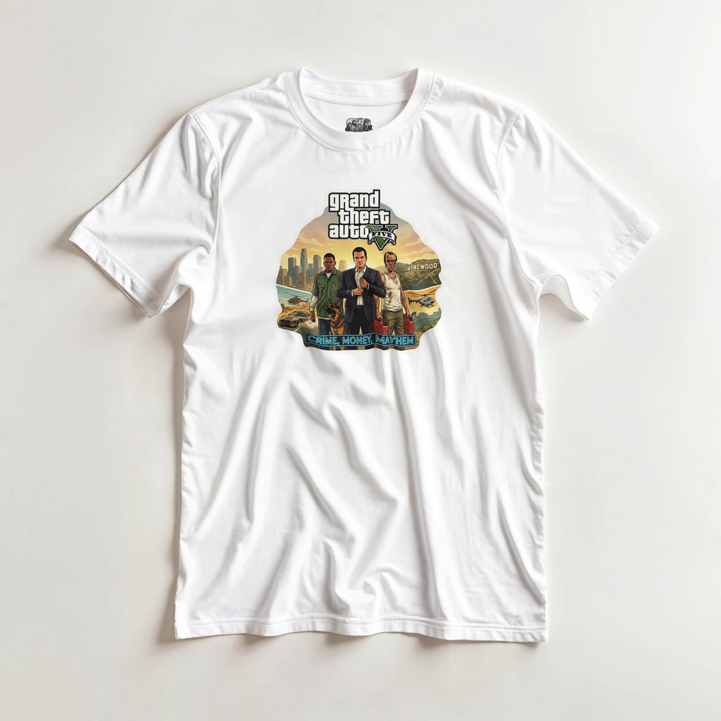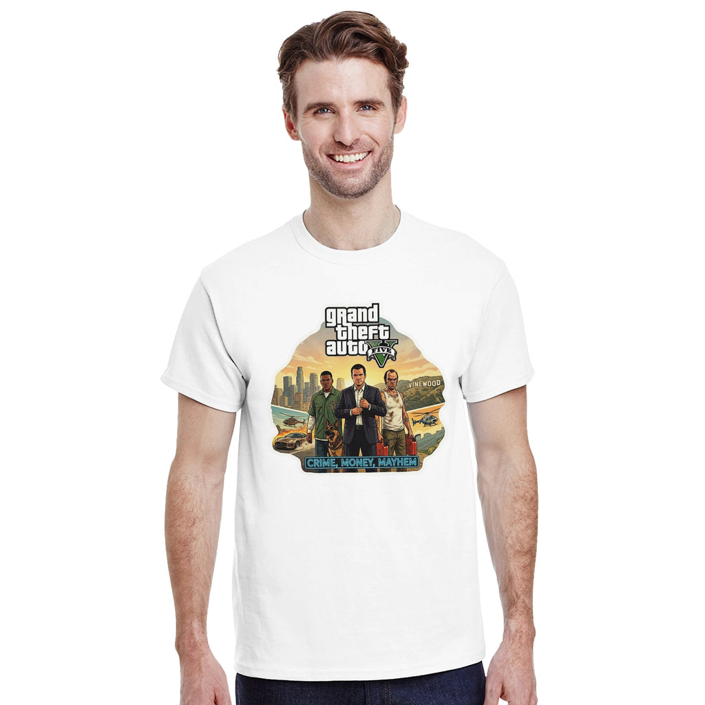 GTA V Crime, Money, Mayhem Heavyweight Unisex T-Shirt | Gildan 5000 brings Los Santos energy to a durable classic fit. The GTA V Crime, Money, Mayhem Heavyweight Unisex T-Shirt | Gildan 5000 is built for long days and longer nights.