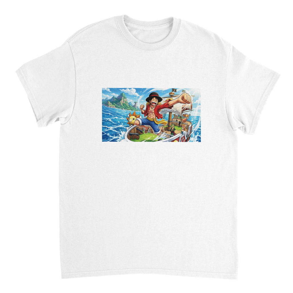 The One Piece Monkey D. Luffy Heavyweight Unisex Crewneck T-Shirt | Gildan 5000 features a seamless double-needle collar, double-needle sleeve and bottom hems, and taped neck and shoulders for durability. It is a strong anime shirt option for fans who want a heavier cotton tee with long-lasting Straw Hat style.