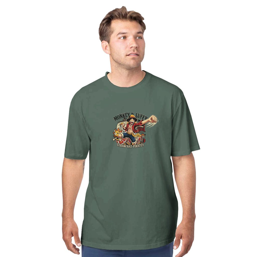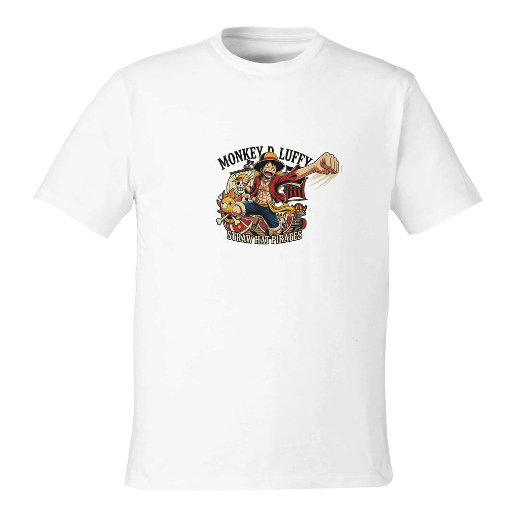 The One Piece Monkey D. Luffy Unisex Reclaimist Crewneck T-Shirt | Econscious EC1070 is made from 100% recycled cotton and features side-seam construction with a tear-away label for added comfort. It is a smart anime apparel option for fans who want a softer hand-feel, responsible materials, and strong Straw Hat style.